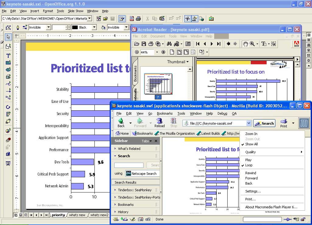 OpenOffice.org now can export presentations and drawings to the Macromedia Flash format (.swf). Thus, it's now possible to view presentations in a simple web browser that has the Flash plugin installed. Recipients and users of Flash presentations don't have to install a special viewer anymore in order to view a presentation.