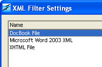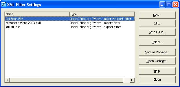The new XML file filter tool makes it easy to integrate new import or export file filters that are based on XSL transformations. A popular use case for the XML filter tool is the support for the new Microsoft Office 2003 XML file formats.